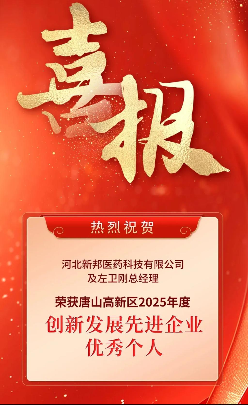 近日,唐山高新区2025年度创新发展表彰名单正式公布,河北新邦医药科技有限公司荣获“创新发展先进企业”称号,公司总经理、唐山师范学院体育系08级校友左卫刚荣膺“创新发展优秀个人”,企业与个人双双载誉,彰显了体育系学子的卓越担当与创新实力。